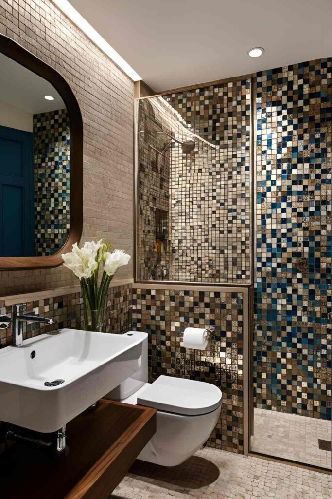 A mosaic feature wall instantly elevates the bathroom’s look.