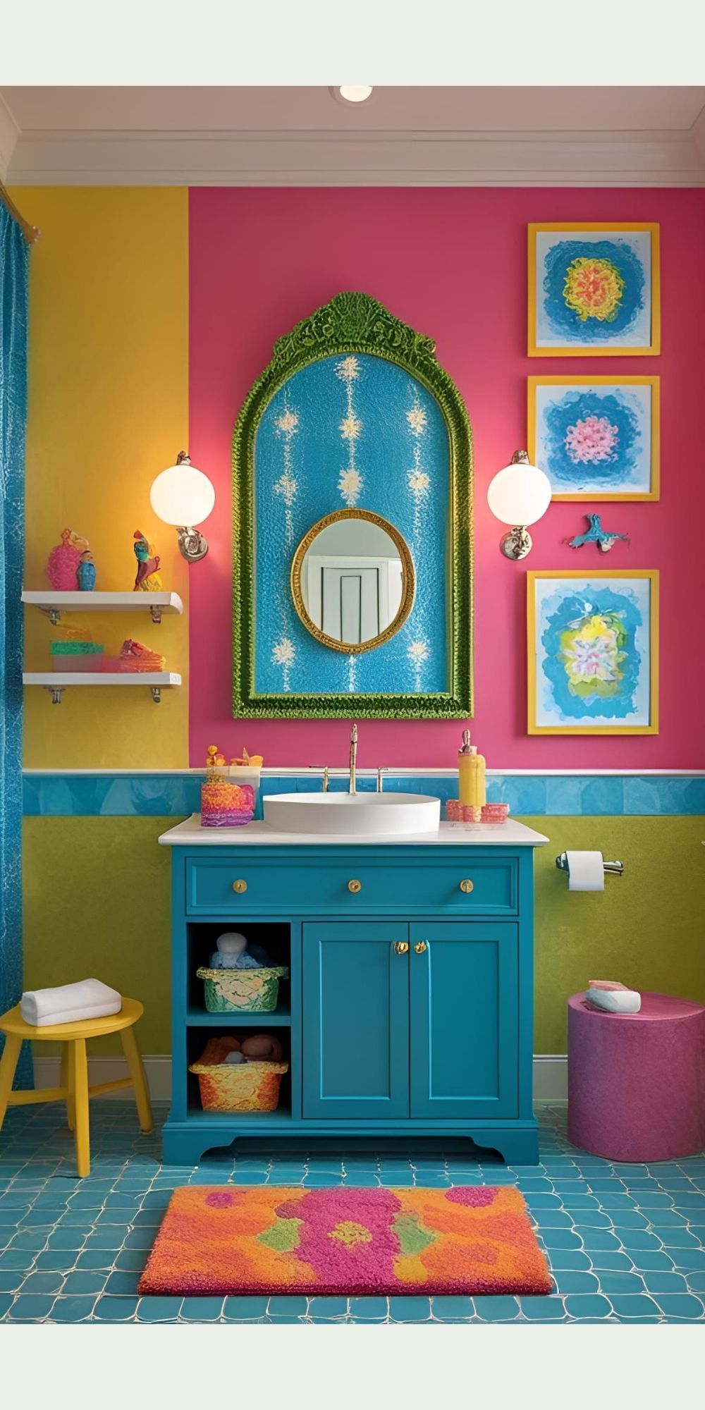 Bright, cheerful shades like aqua, mint, yellow, or soft pastels make bathrooms feel lively and welcoming.