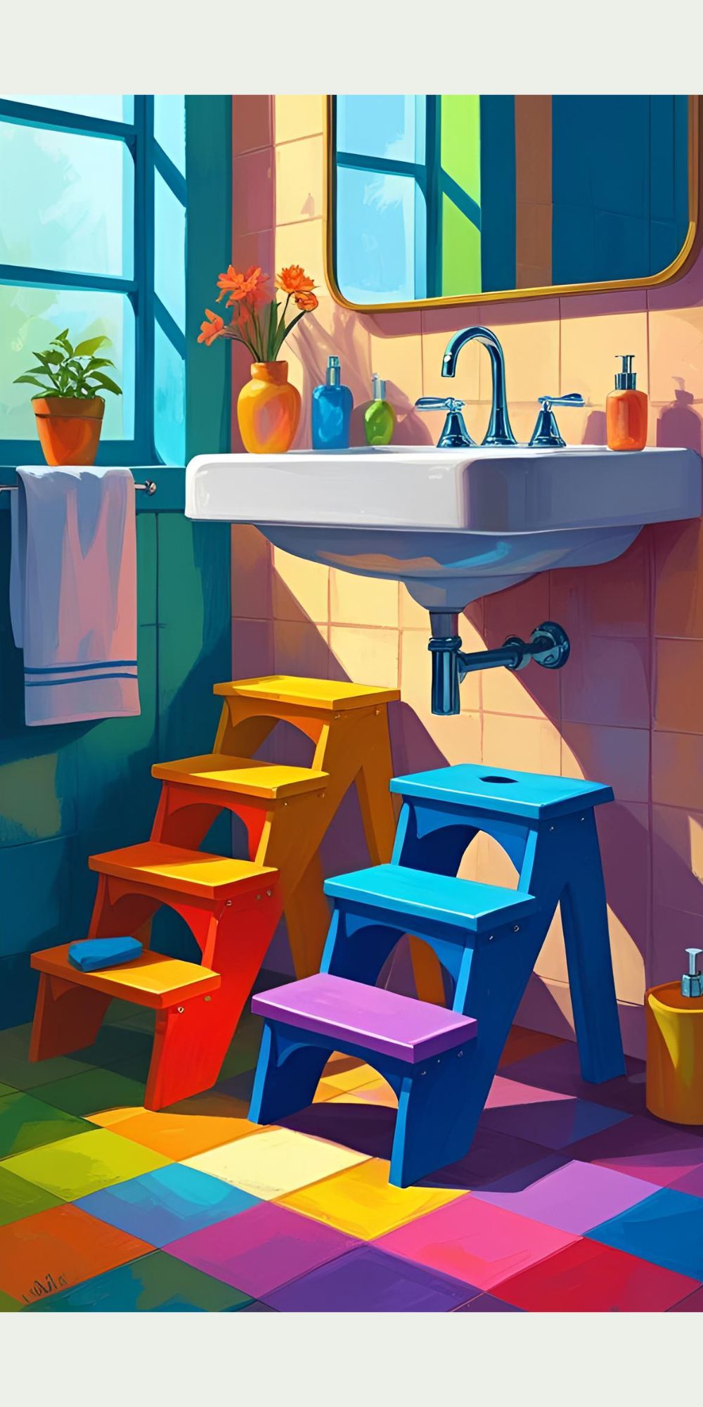 Practical and playful, a bright stool helps kids reach the sink while doubling as décor.