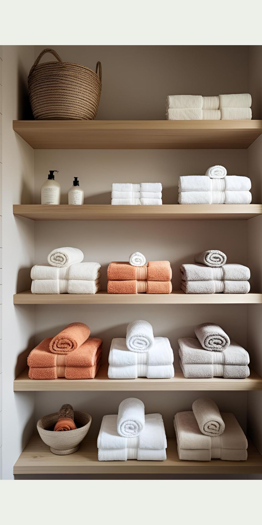 Display neatly folded towels in matching colors for a decorative and functional storage solution.