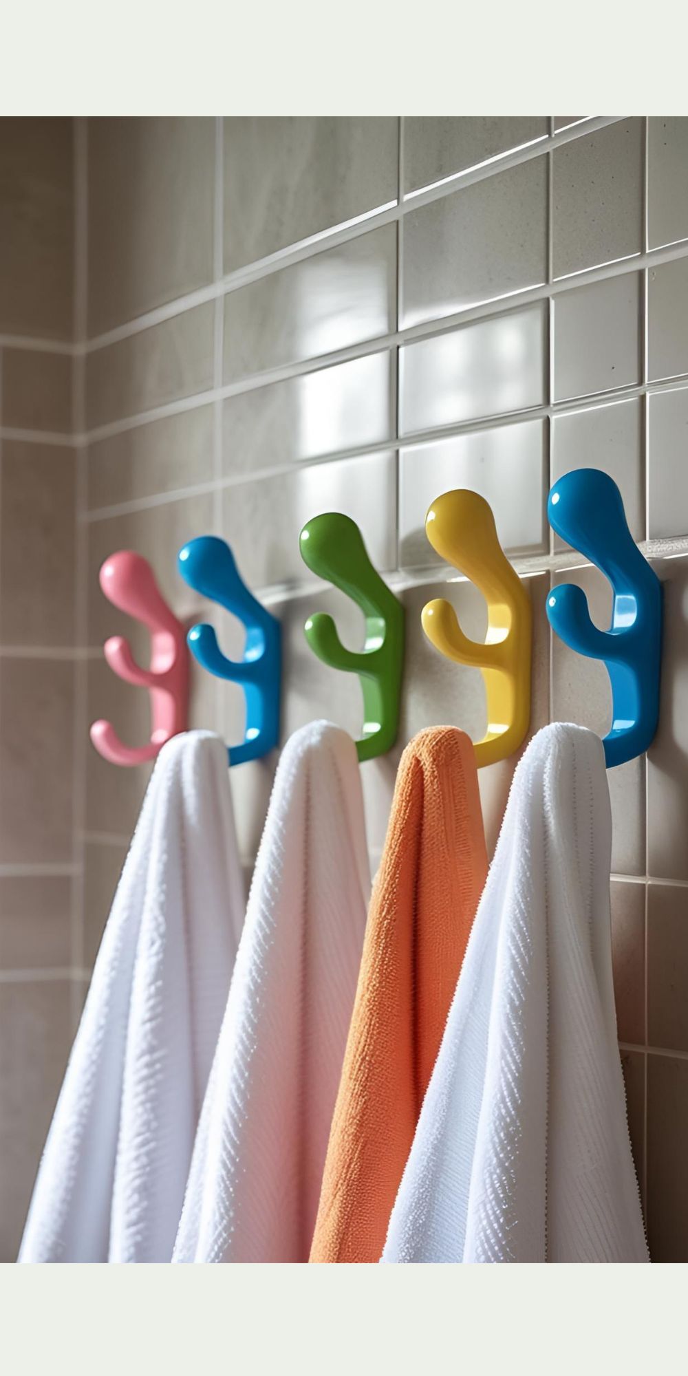 Color-coded hooks add décor while teaching kids to hang up their towels.