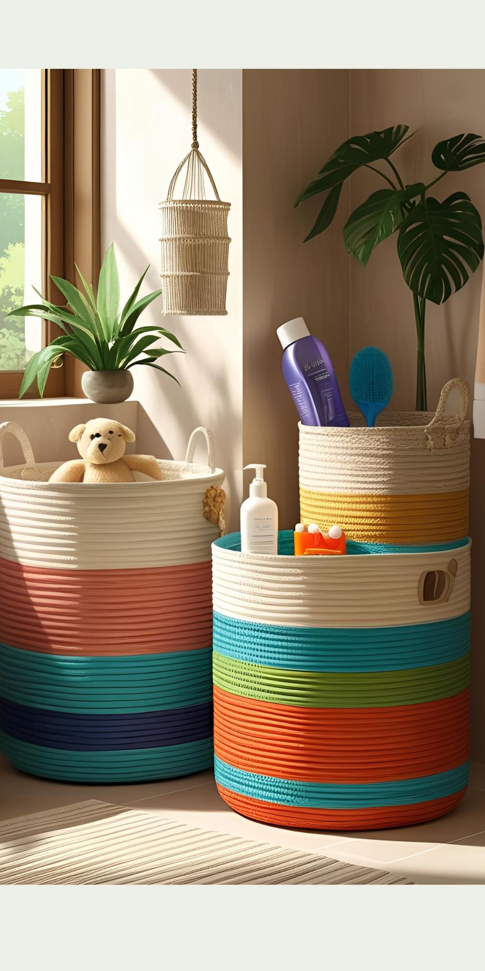 Neutral or colorful baskets keep toys and toiletries tidy while adding texture to décor.
