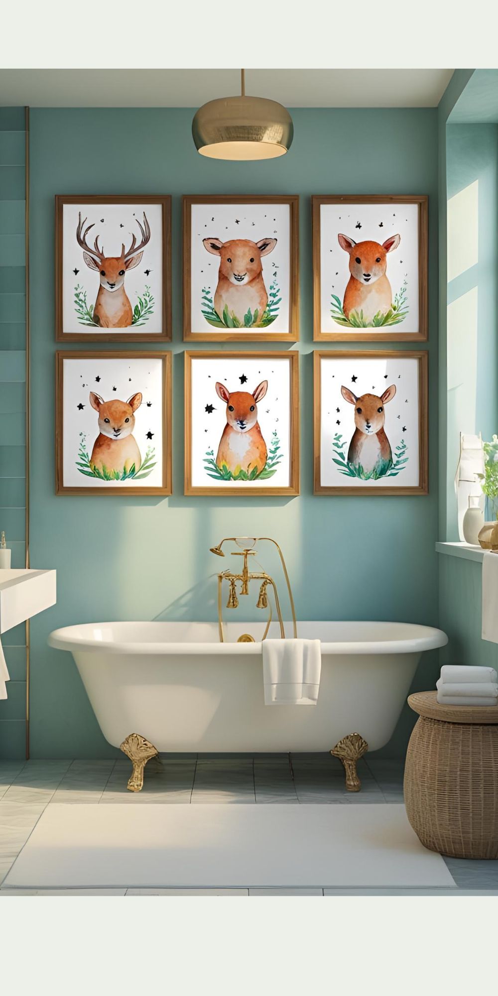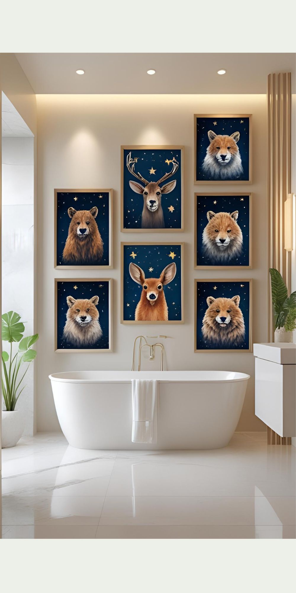 Framed waterproof prints featuring animals, stars, or nature bring a polished finishing touch.