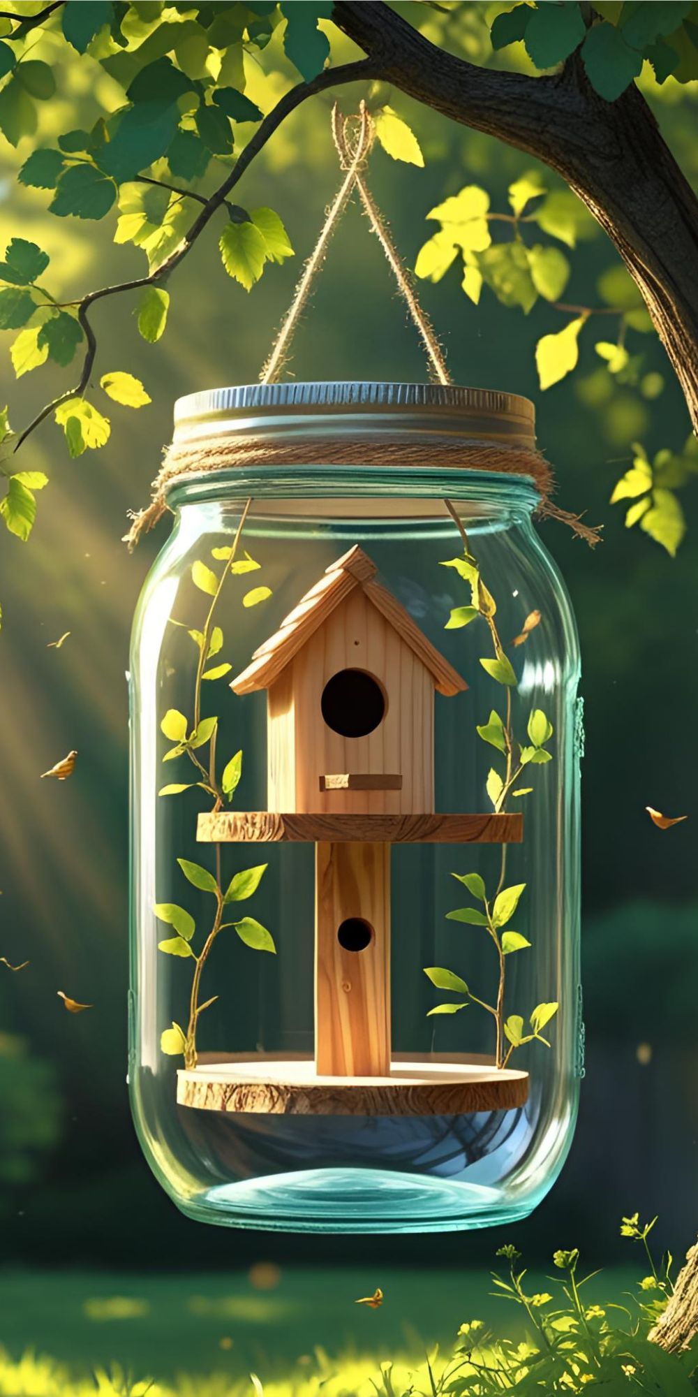 Use an empty mason jar with a wooden perch inside, decorated with non-toxic paint, for a charming feeder-style home.