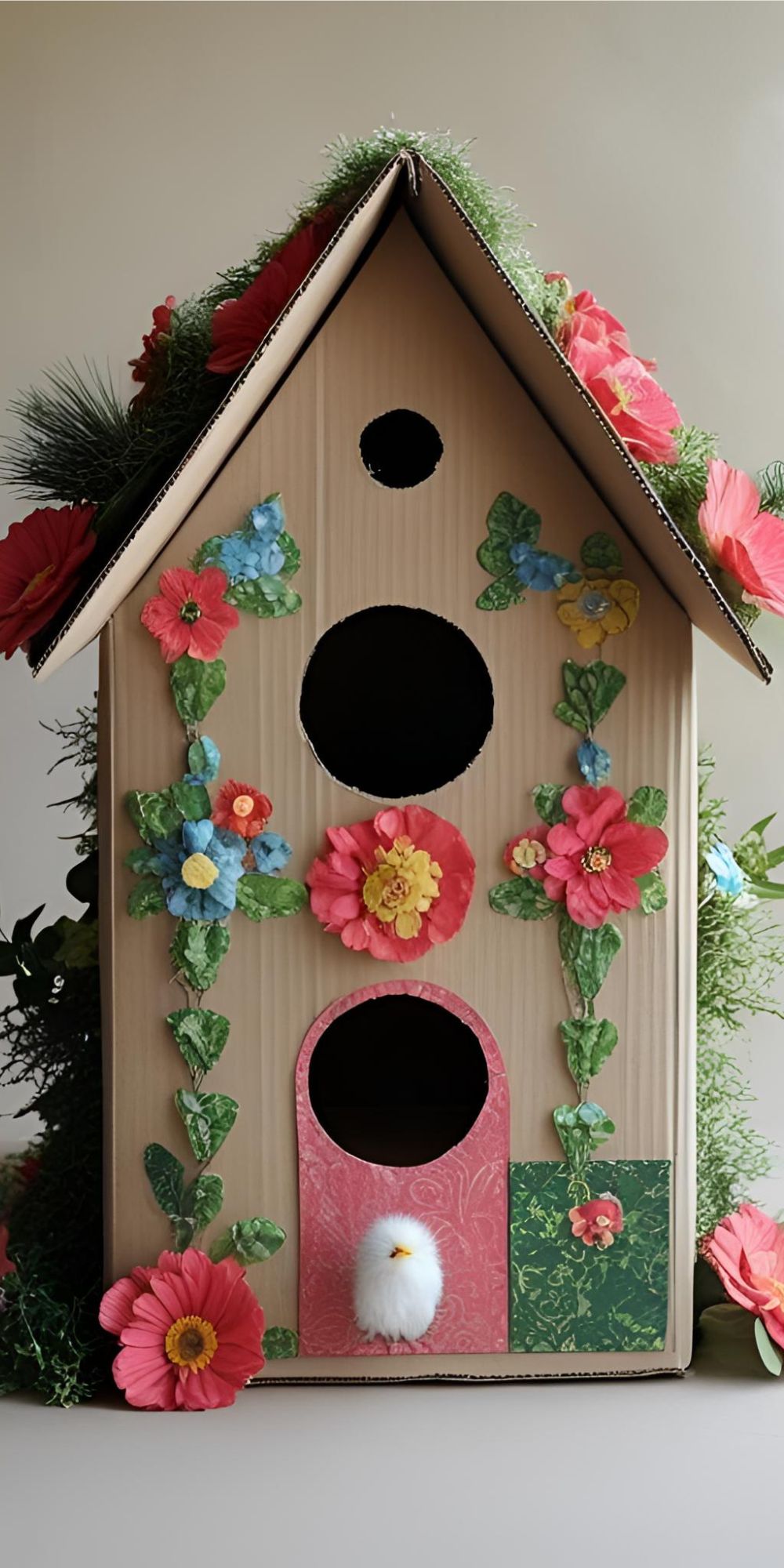 Cut a round hole in a shoebox, decorate it, and protect it with a waterproof coating for outdoor use.