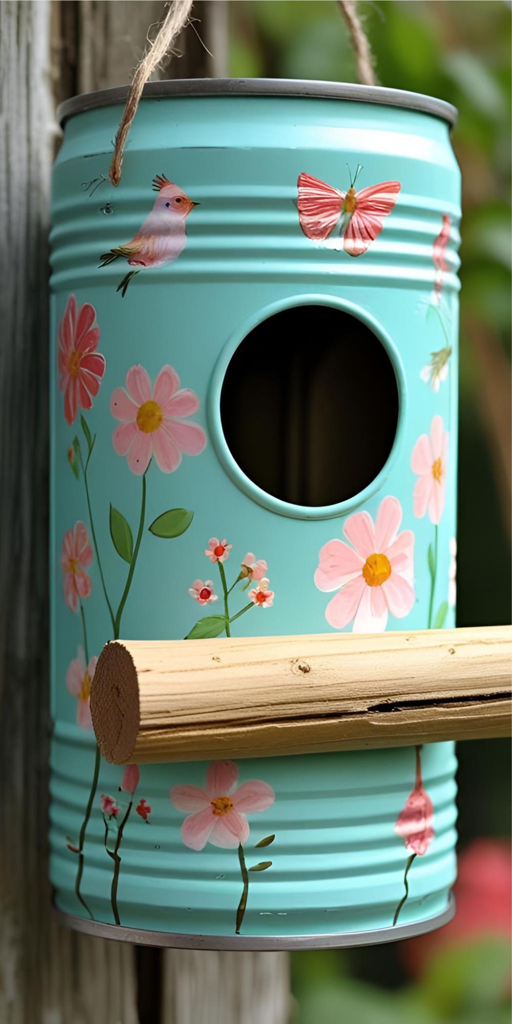 Paint an empty tin can, add a wooden dowel perch, and mount it horizontally for a cozy bird space.