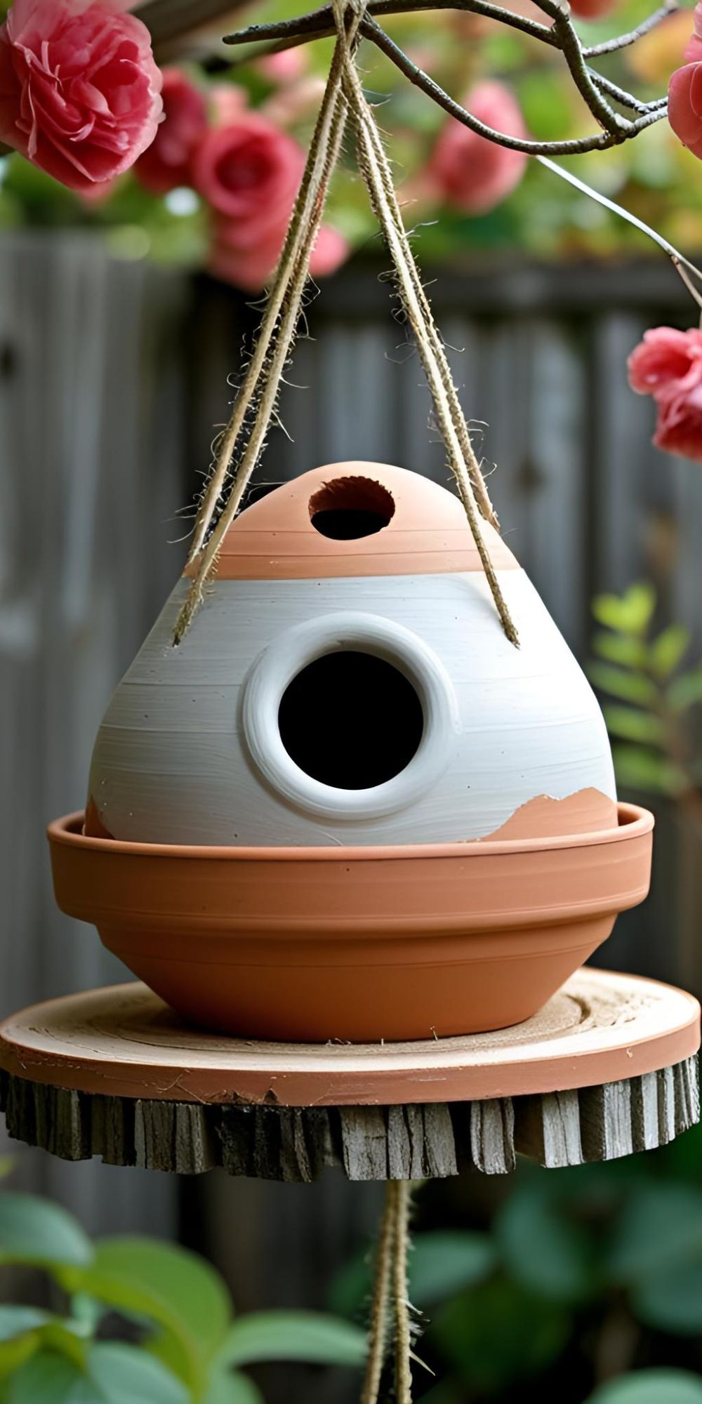 Invert a clay pot, cut a hole in the base, and add twine for hanging — a sturdy, long-lasting design.