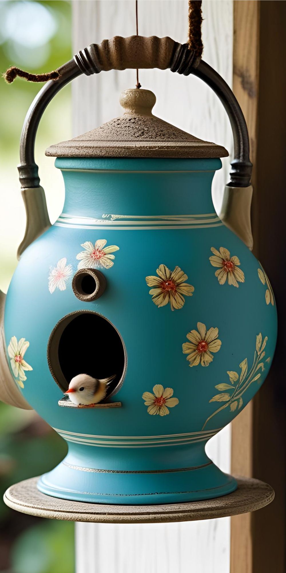 Hang an old teapot sideways so the spout acts as a perch — quirky and inviting for small birds.
