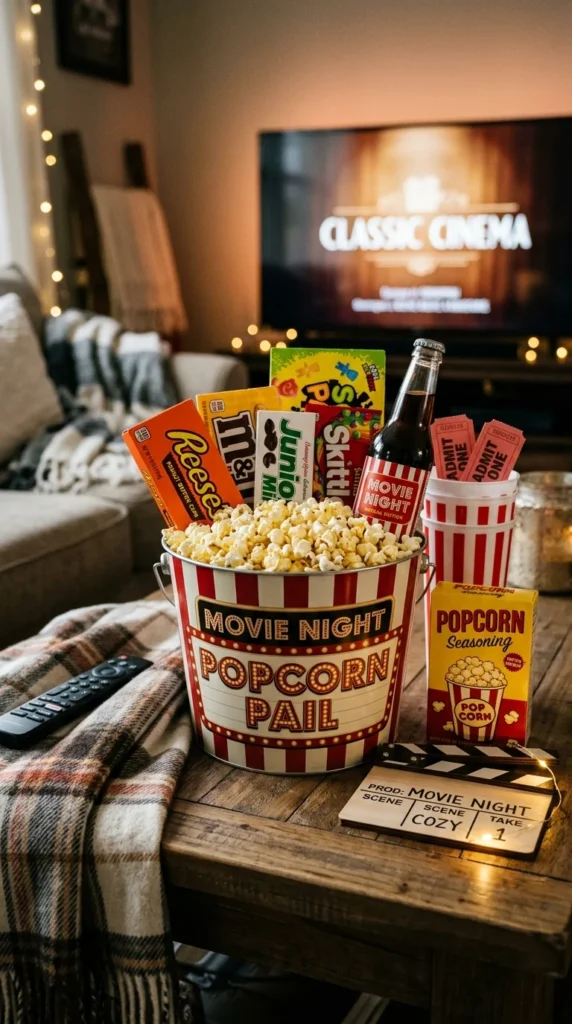 Transform a simple evening at home into a cinematic experience by assembling a movie-themed pail for someone who loves the big screen.