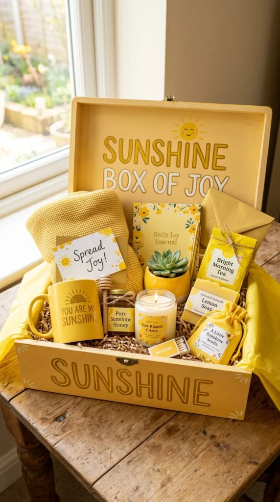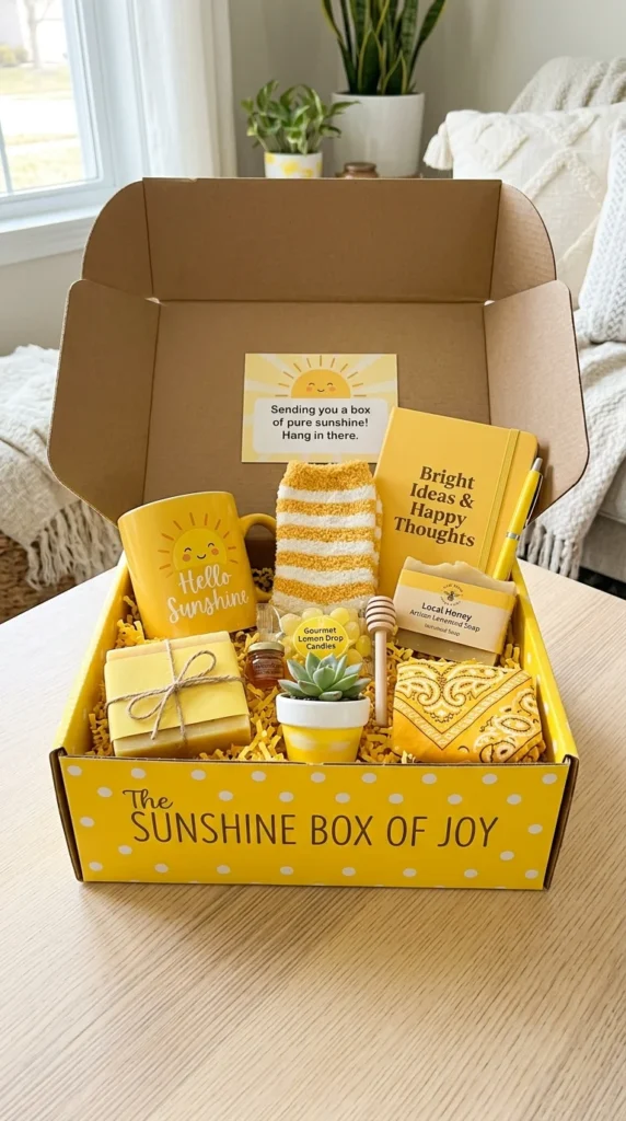 A sunshine box is designed to brighten anyone’s mood instantly by using a vibrant and cohesive color theme throughout the entire gift set.