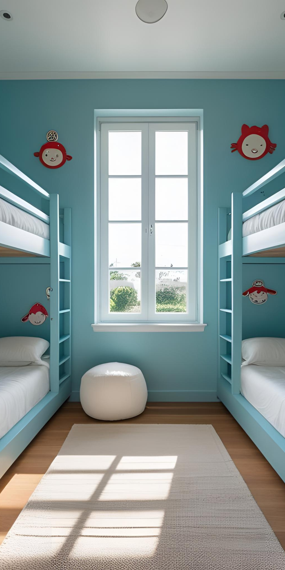 Installing bunk beds across one wall creates a sleep zone while freeing up the rest of the room.