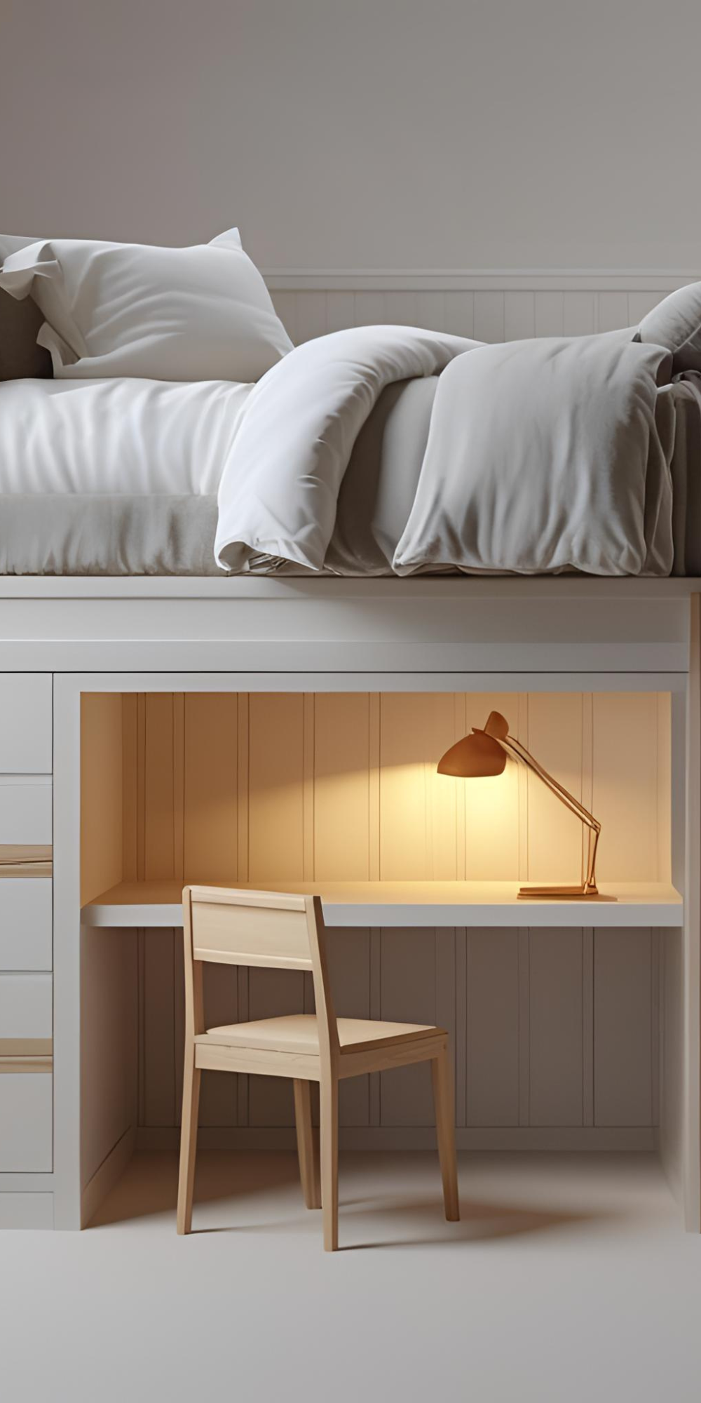 A loft-style bed with a desk underneath makes dual use of vertical space.