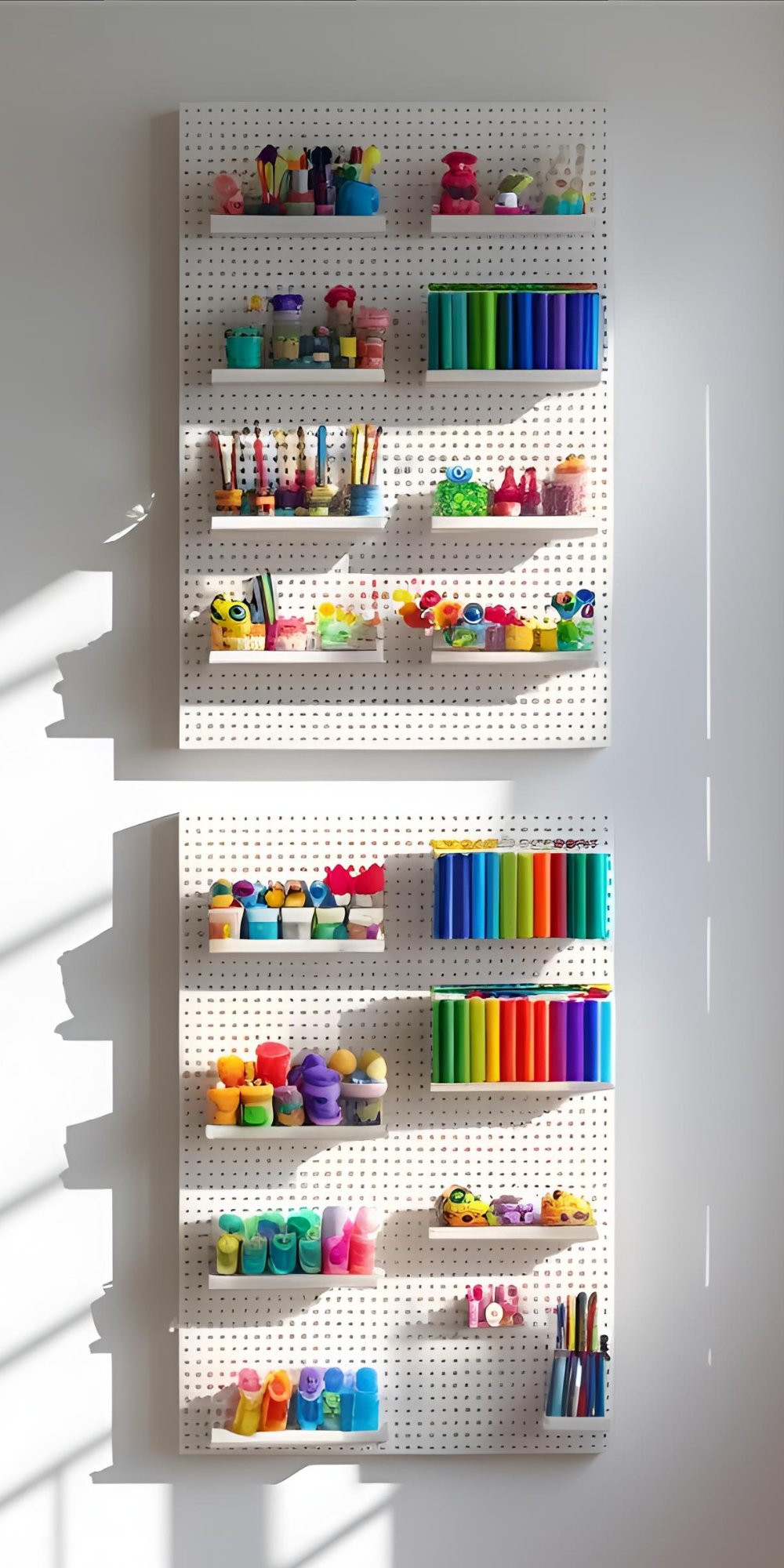 Pegboards on the wall keep art supplies, small toys, or accessories within reach.