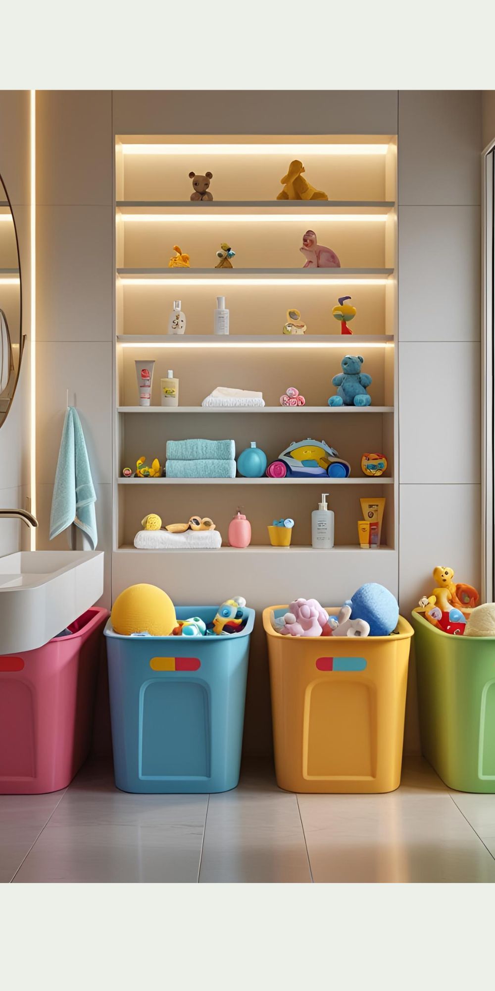Use labeled bins or baskets for each child’s toiletries and bath toys. This keeps clutter under control.