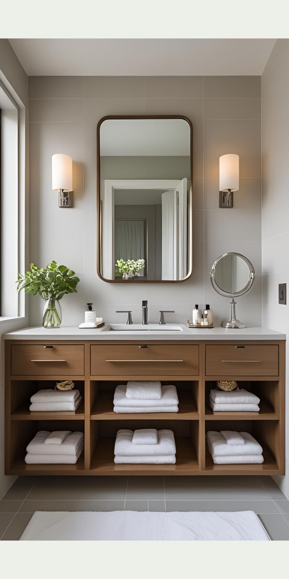 Use wall-mounted storage, labeled bins, and compact vanities with drawers to prevent clutter.