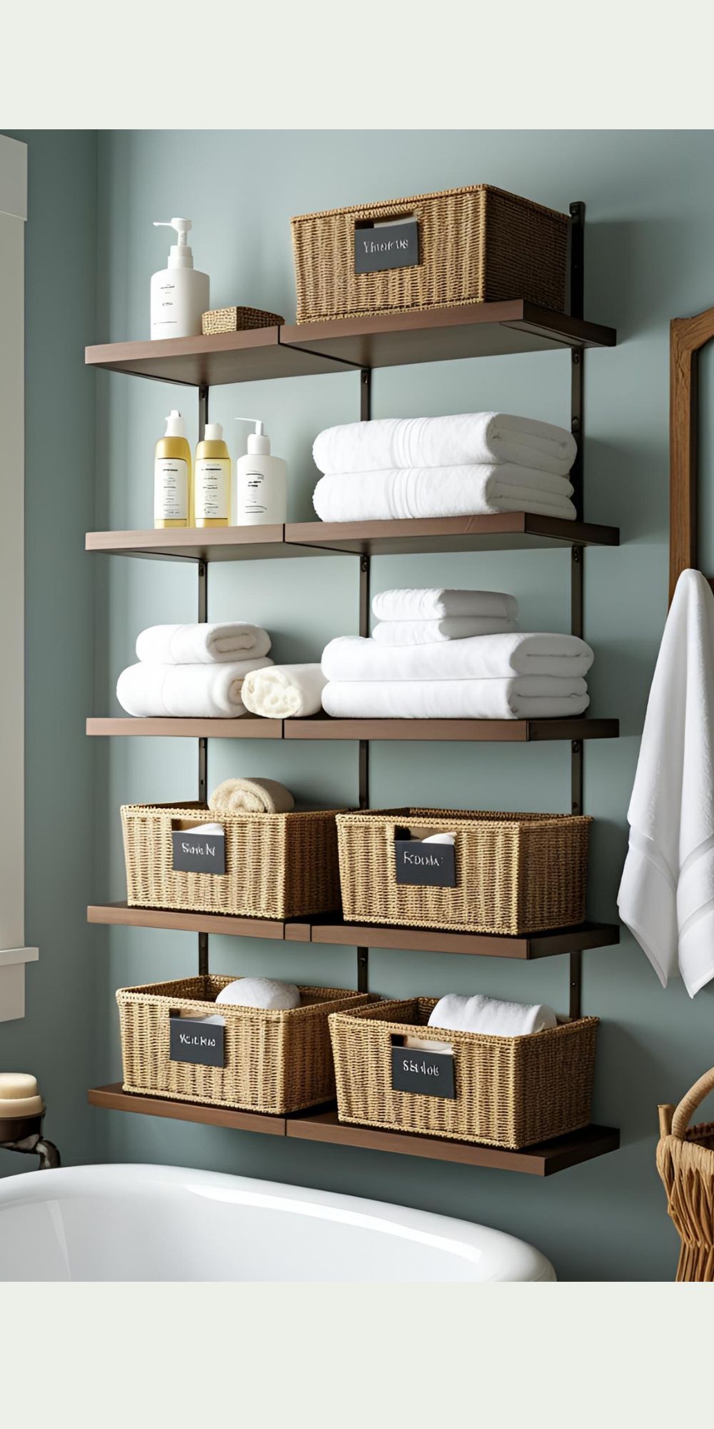 Floating shelves or wall organizers make use of vertical space. Baskets or labeled bins on shelves keep bath toys, towels, and toiletries easy to find.