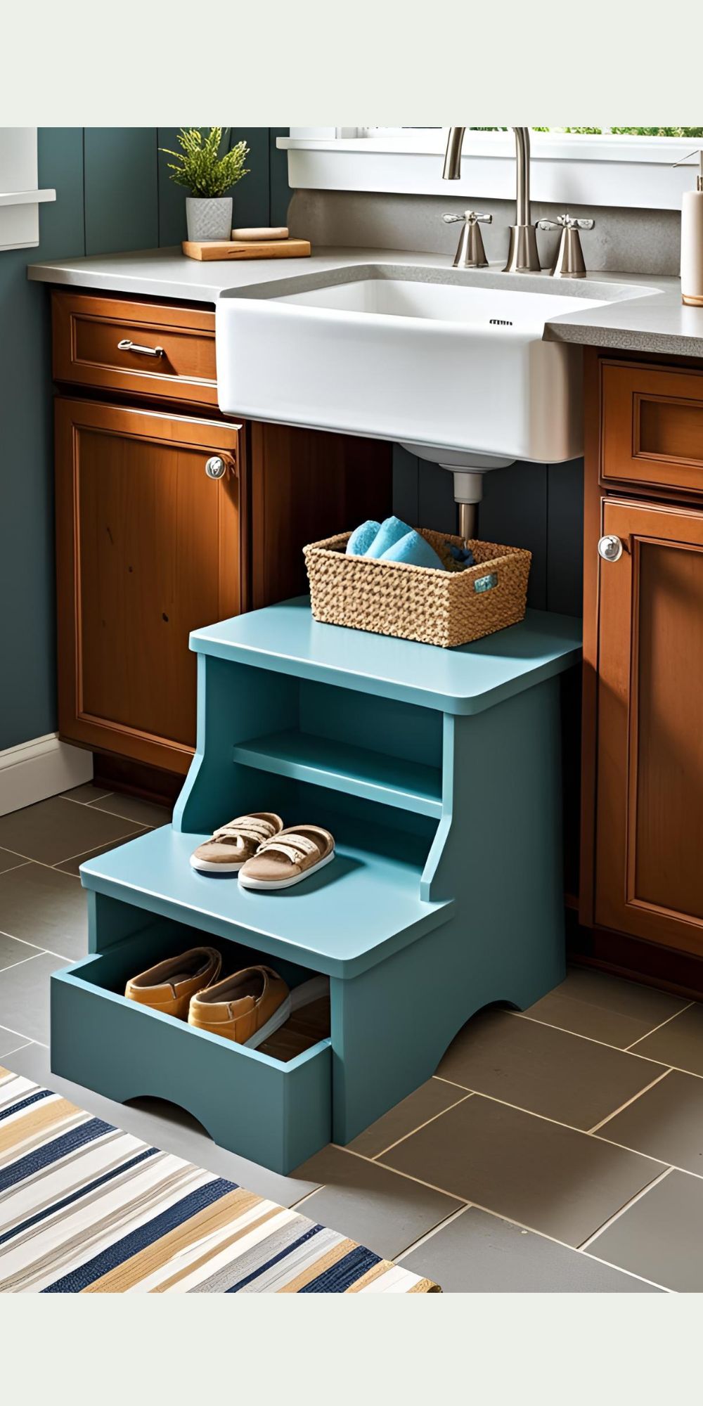 A sturdy step stool helps kids reach the sink safely. Multi-purpose stools that double as storage boxes also hide away small items.
