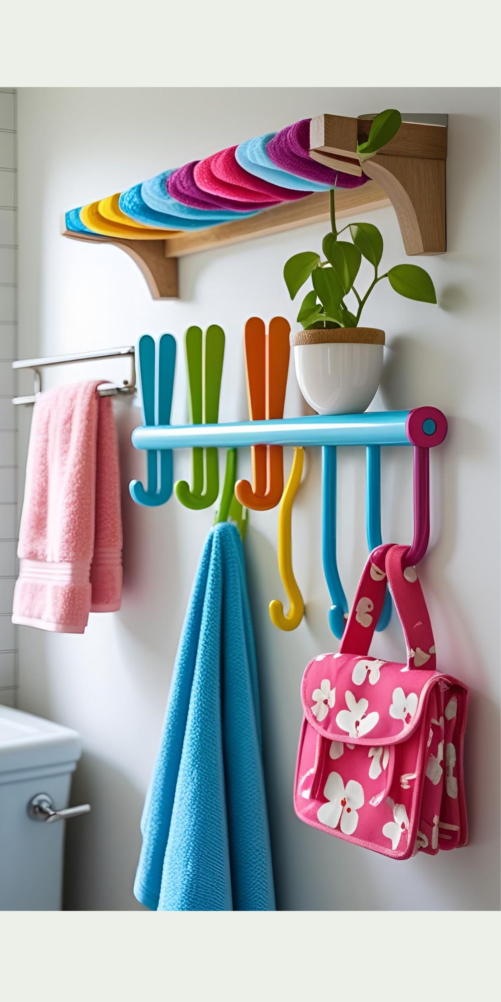 Instead of bulky towel racks, install colorful hooks or peg rails. They’re easier for kids to use and keep the bathroom more organized in tight spaces.