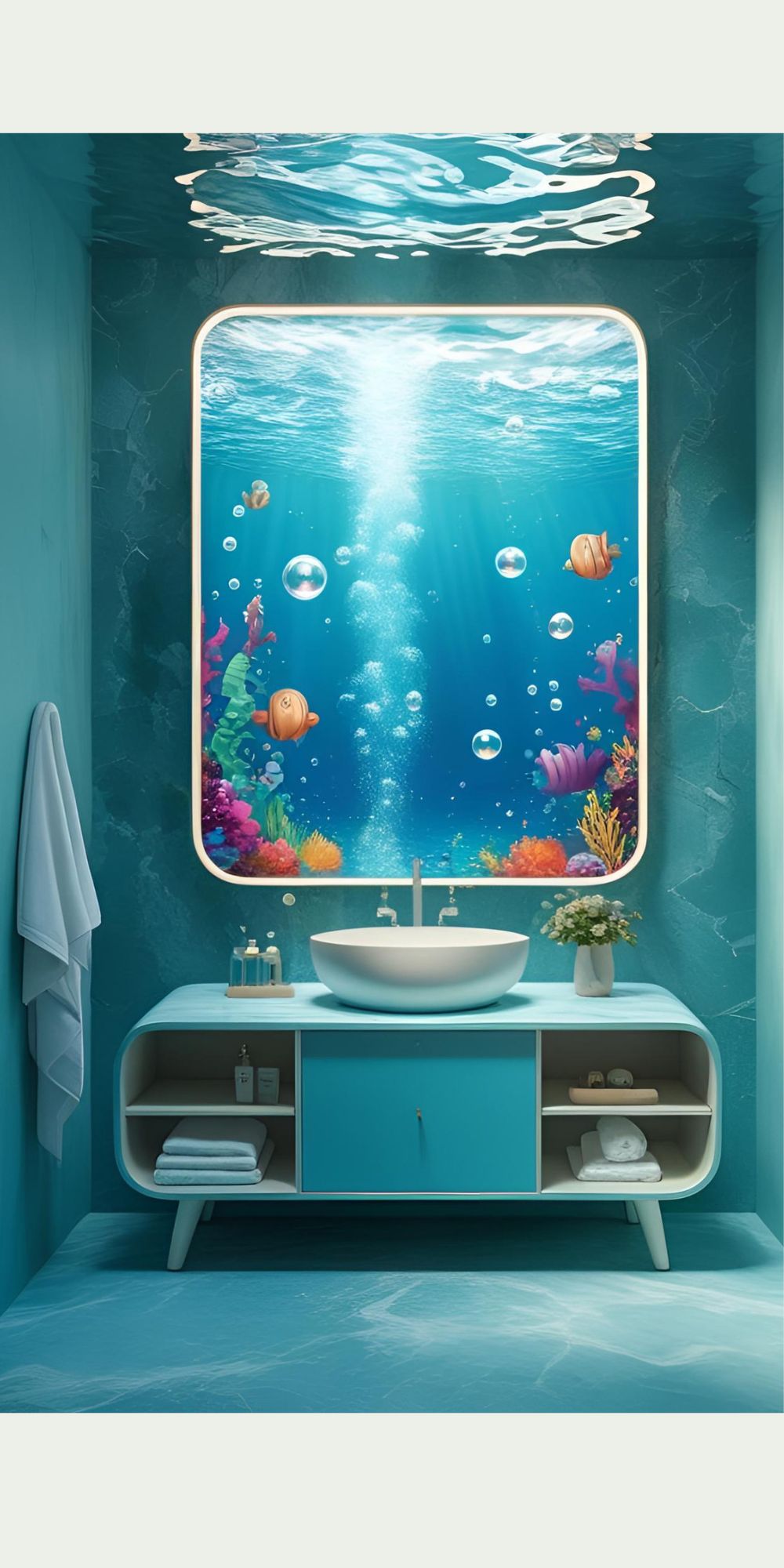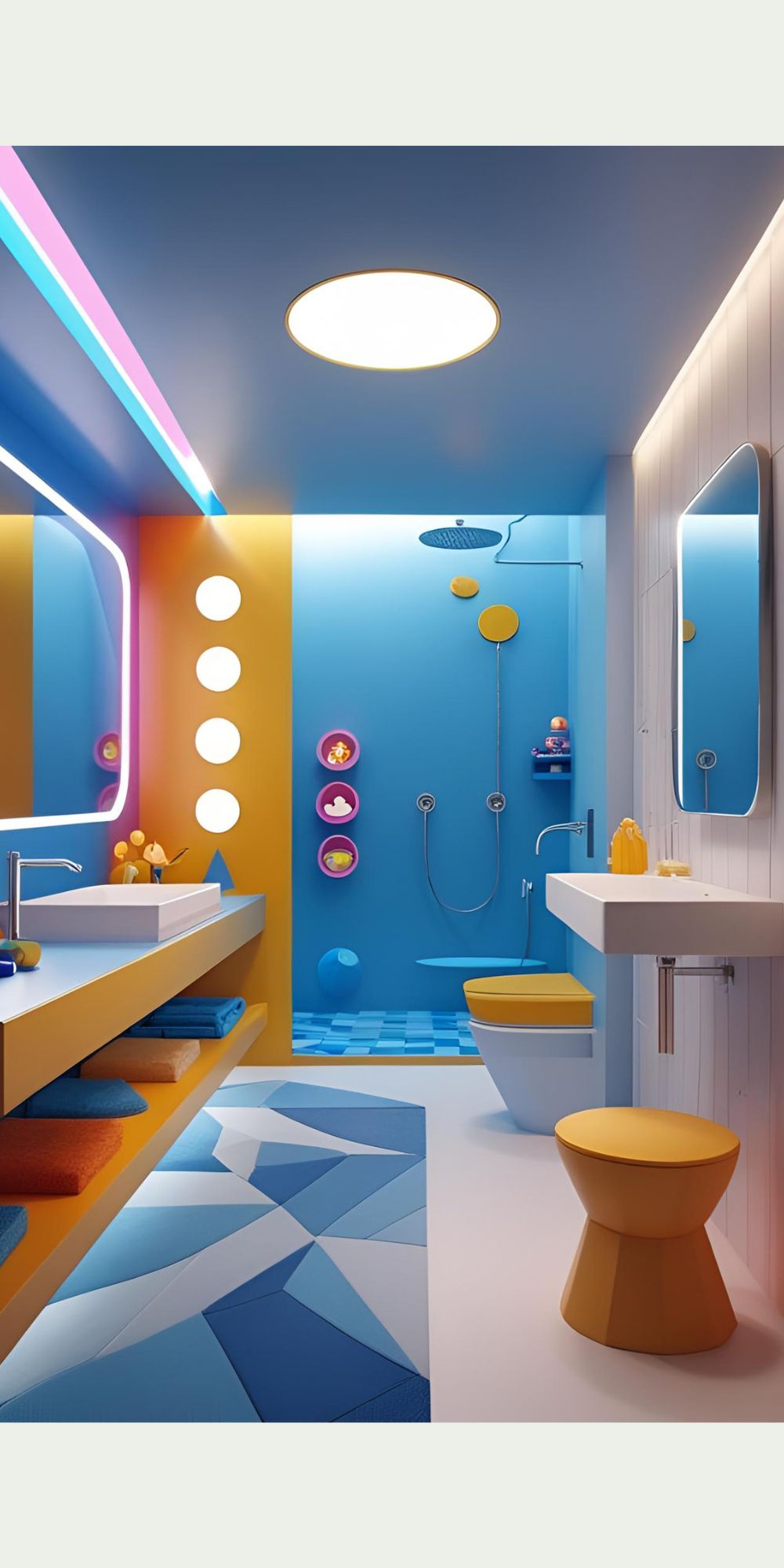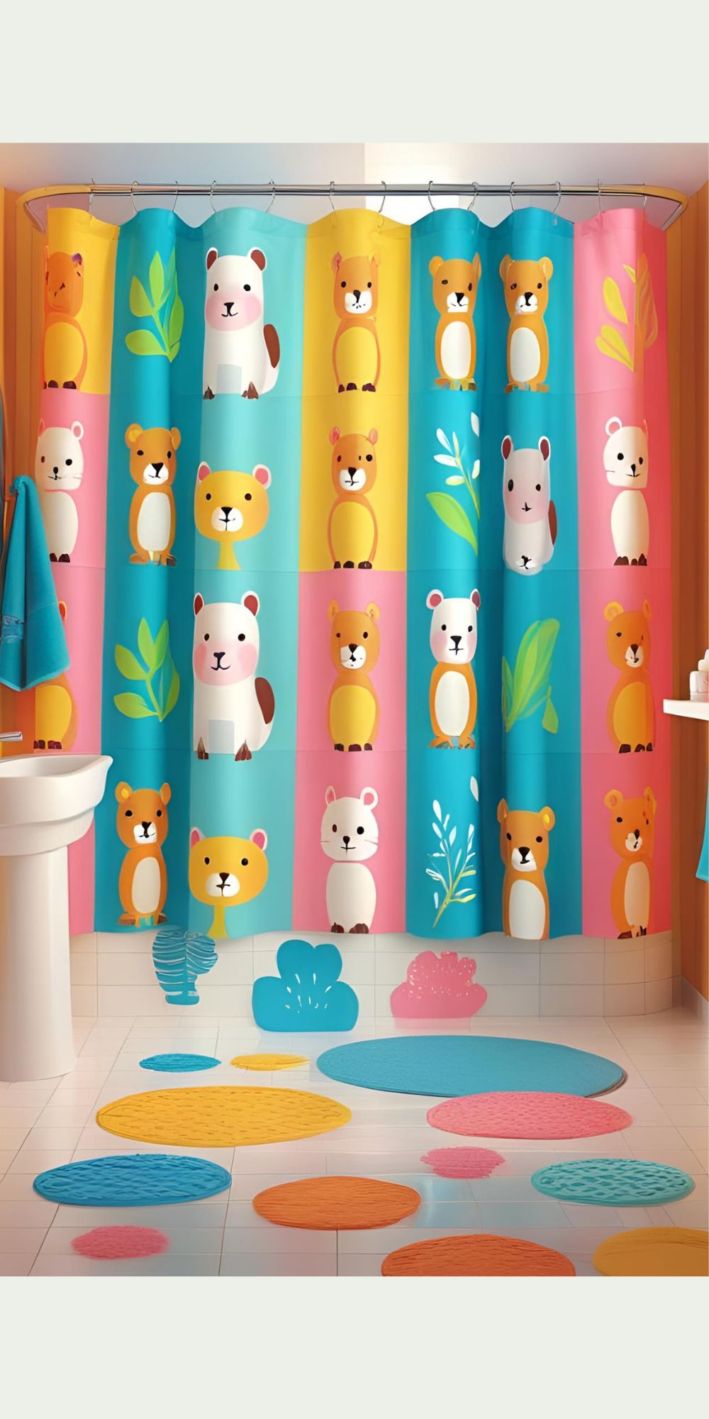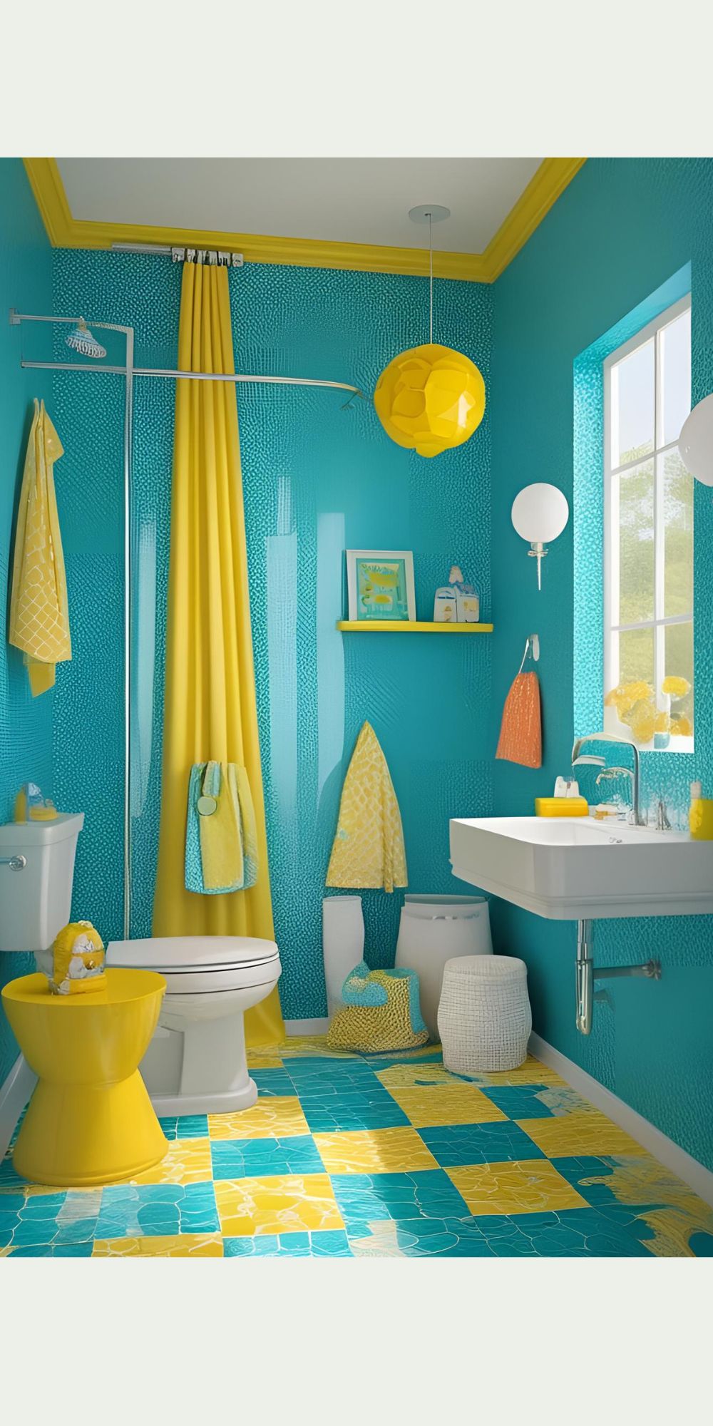 Bright, cheerful shades like aqua, yellow, or pastel tones make the bathroom fun and inviting.