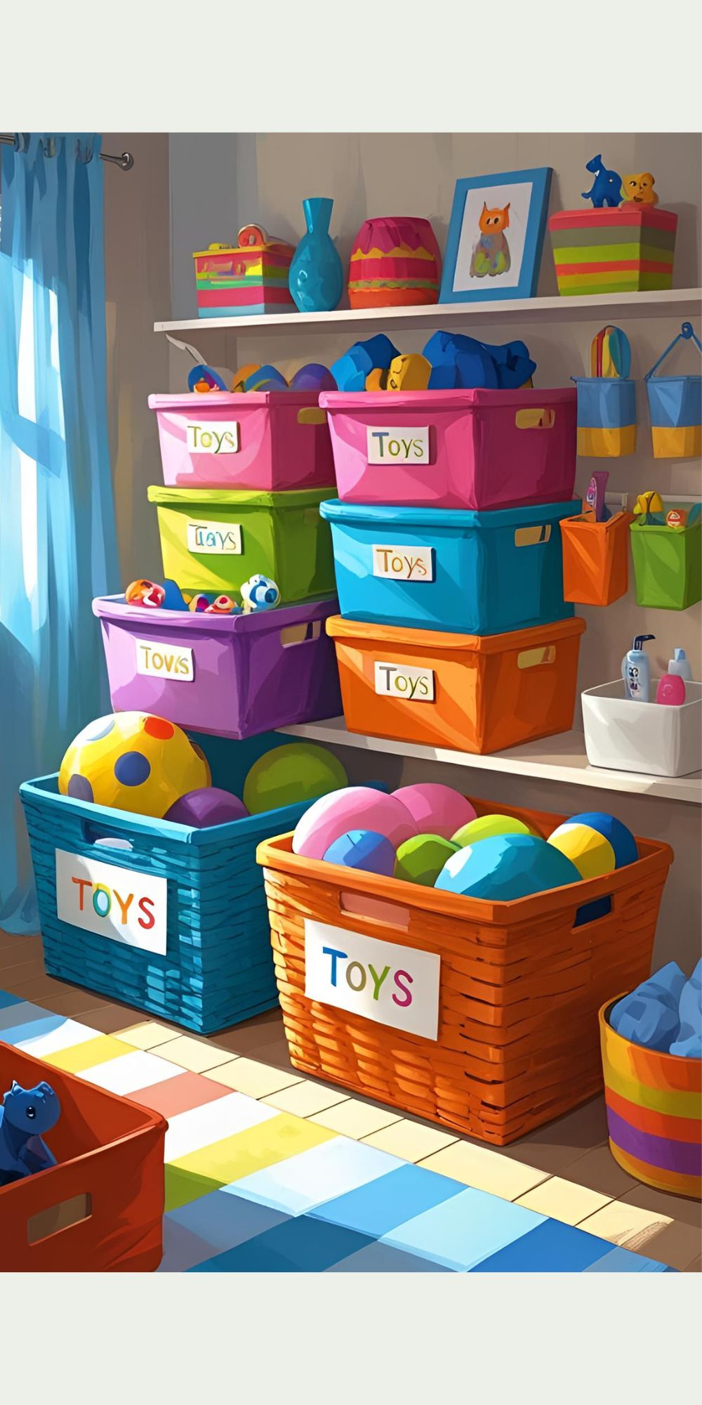 Labeled bins or woven baskets keep toys, toiletries, and towels neatly organized.