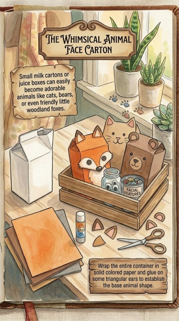 Small milk cartons or juice boxes can easily become adorable animals like cats, bears, or even friendly little woodland foxes.