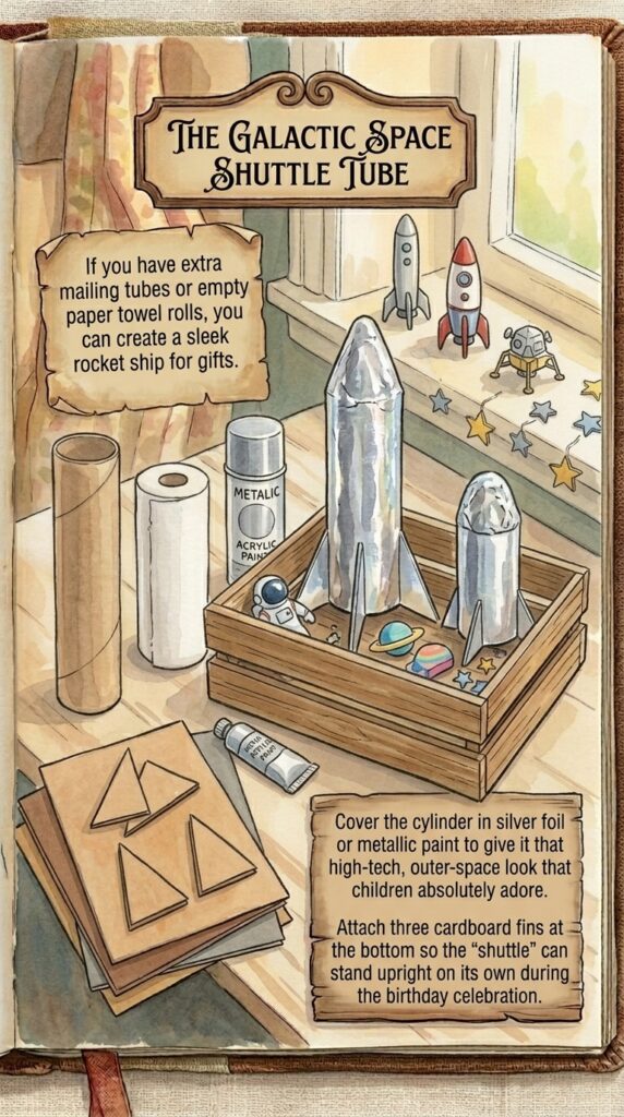 If you have extra mailing tubes or empty paper towel rolls, you can create a sleek rocket ship for gifts.