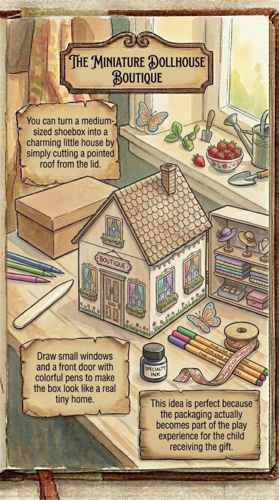 Inside, you can place small dolls, furniture, or even tiny clothing items that fit the theme of a cozy cottage.