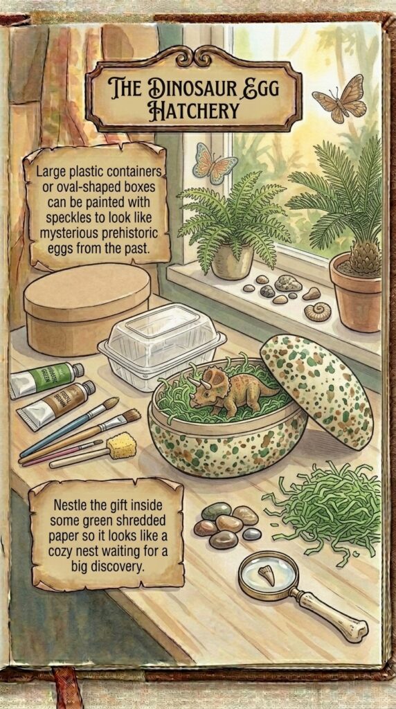 Large plastic containers or oval-shaped boxes can be painted with speckles to look like mysterious prehistoric eggs from the past.