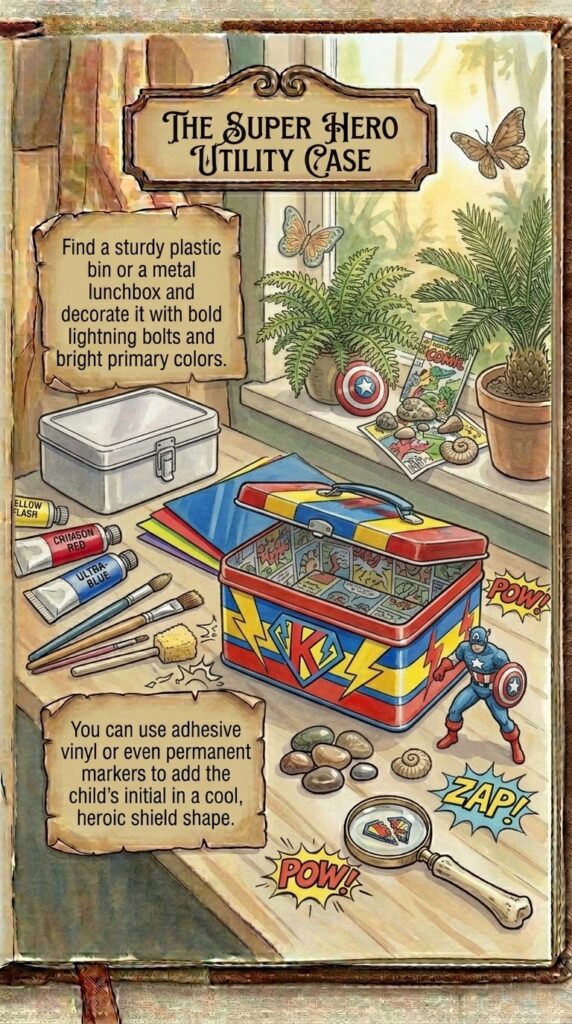 Find a sturdy plastic bin or a metal lunchbox and decorate it with bold lightning bolts and bright primary colors.