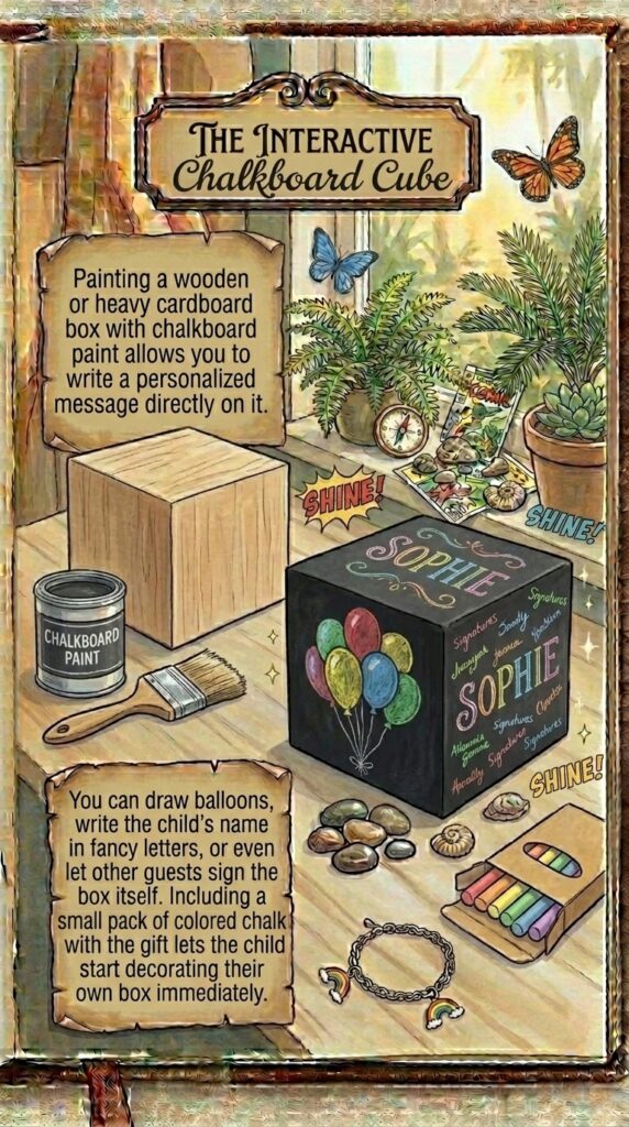 Including a small pack of colored chalk with the gift lets the child start decorating their own box immediately.