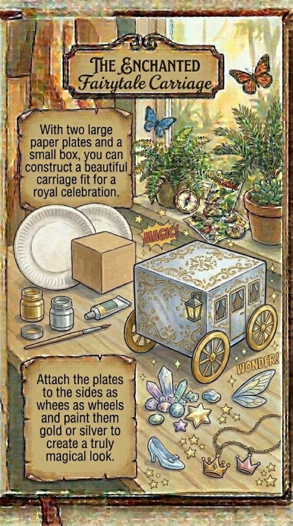 With two large paper plates and a small box, you can construct a beautiful carriage fit for a royal celebration.