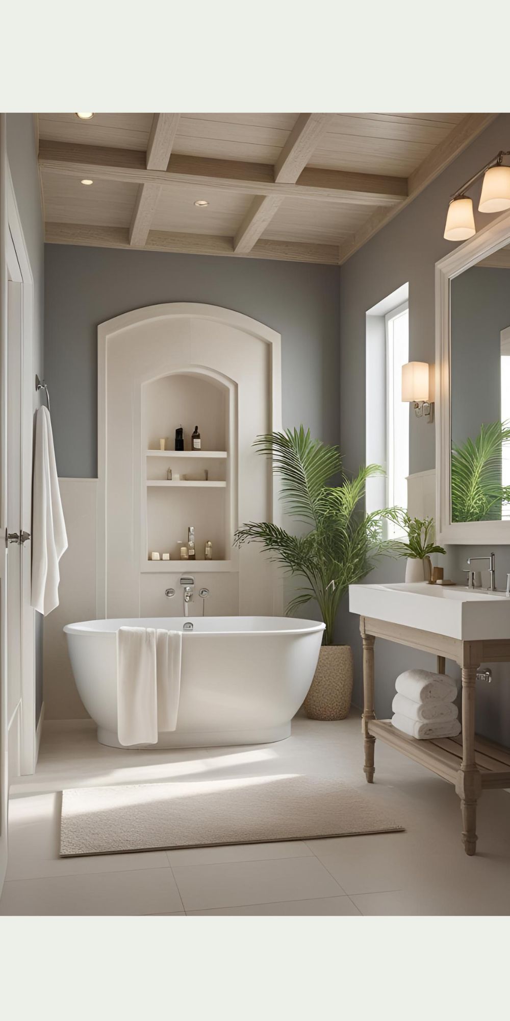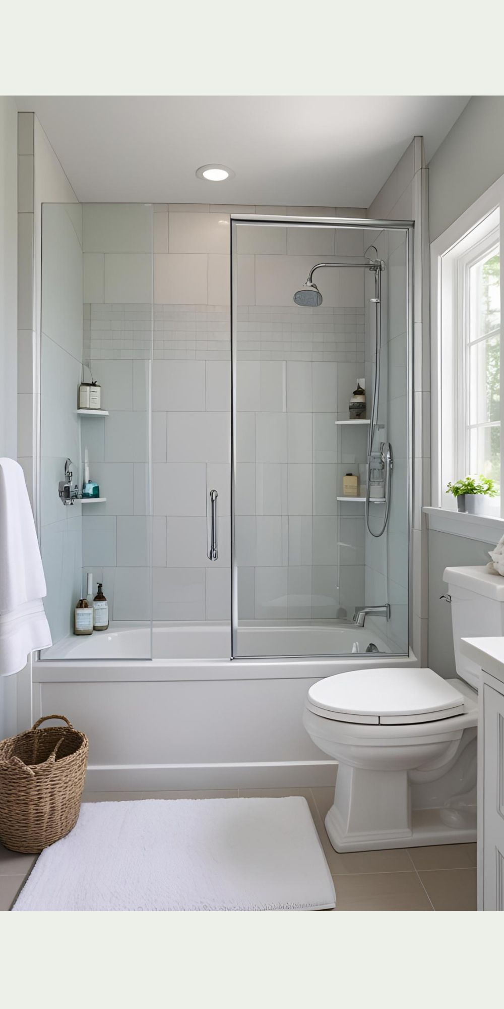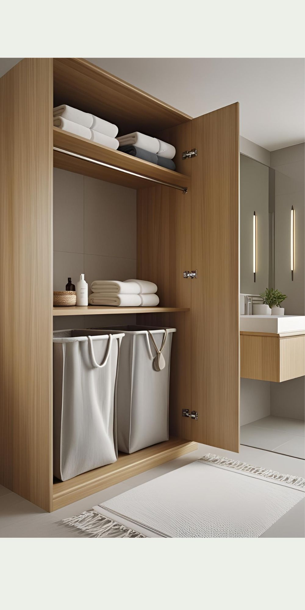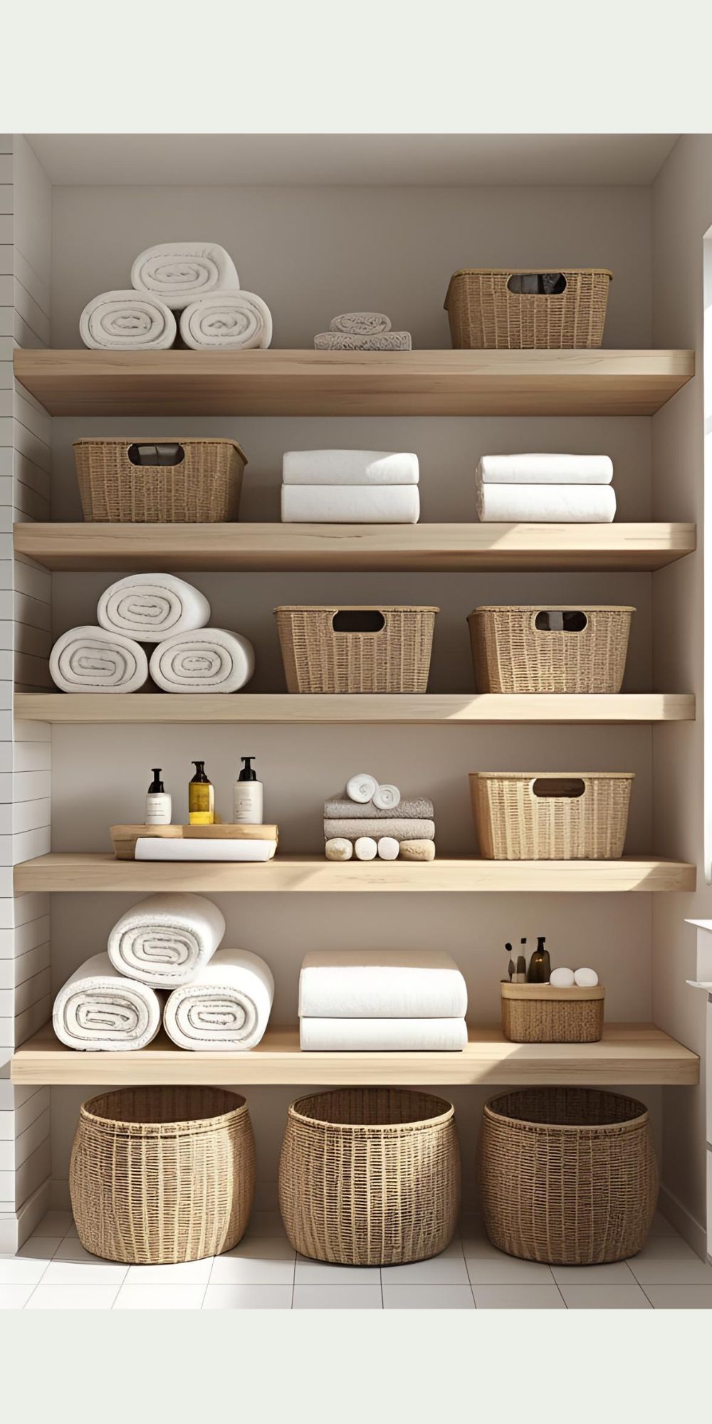 Add open shelving for baskets, bins, and extra towels to keep the space clutter-free.