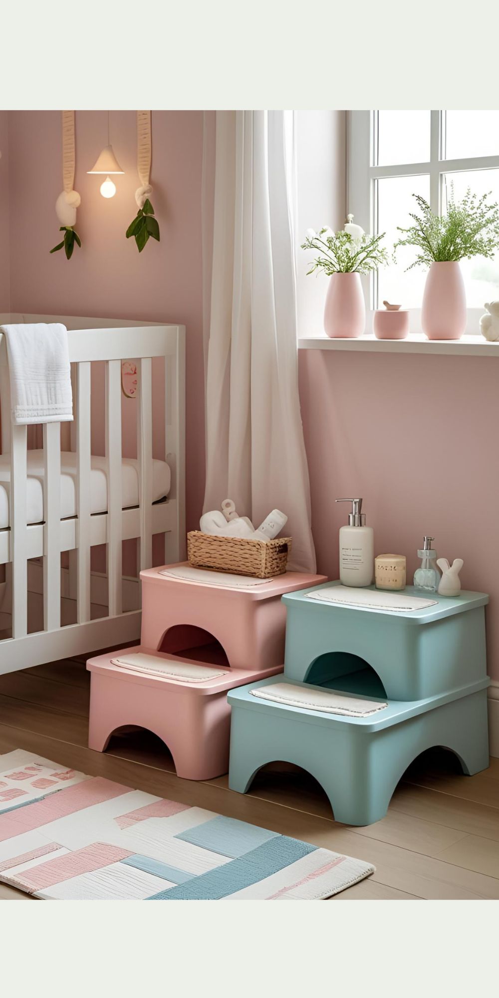 Multi-purpose stools help kids reach the sink while doubling as storage for small items.