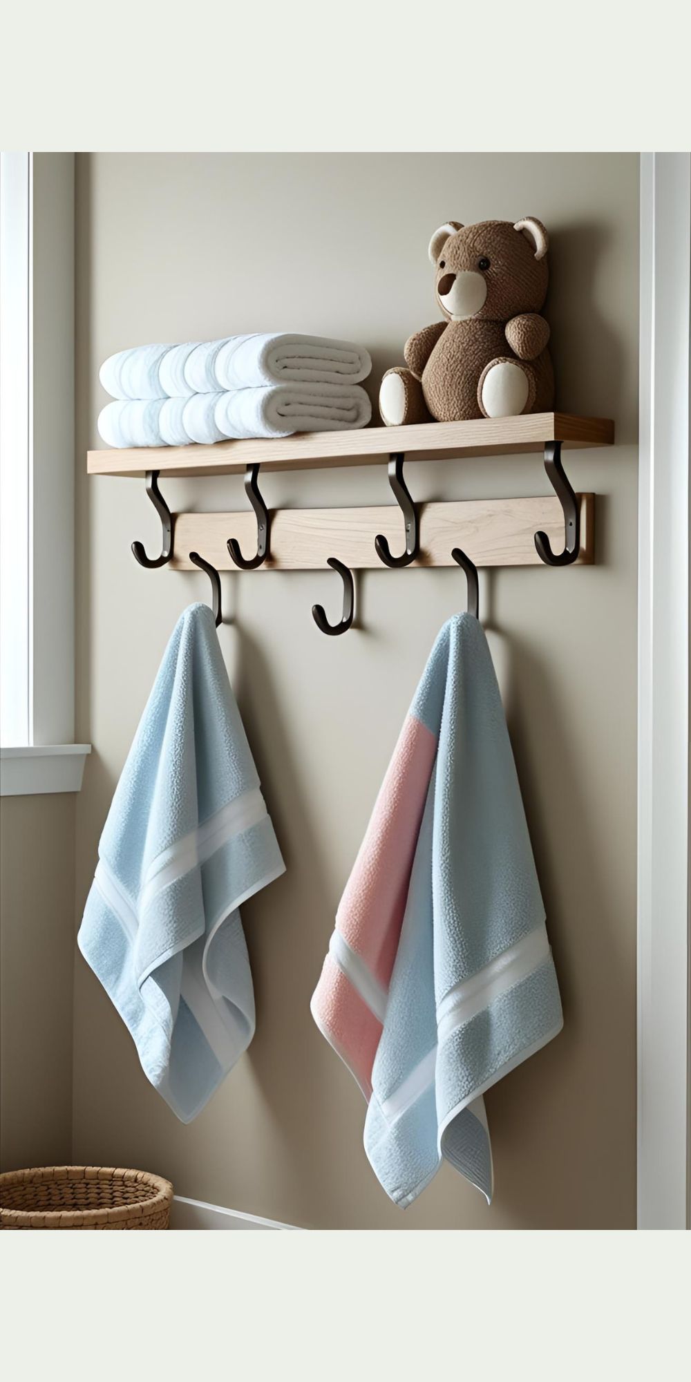 Wall hooks at kid height make it easier for children to hang up towels neatly.