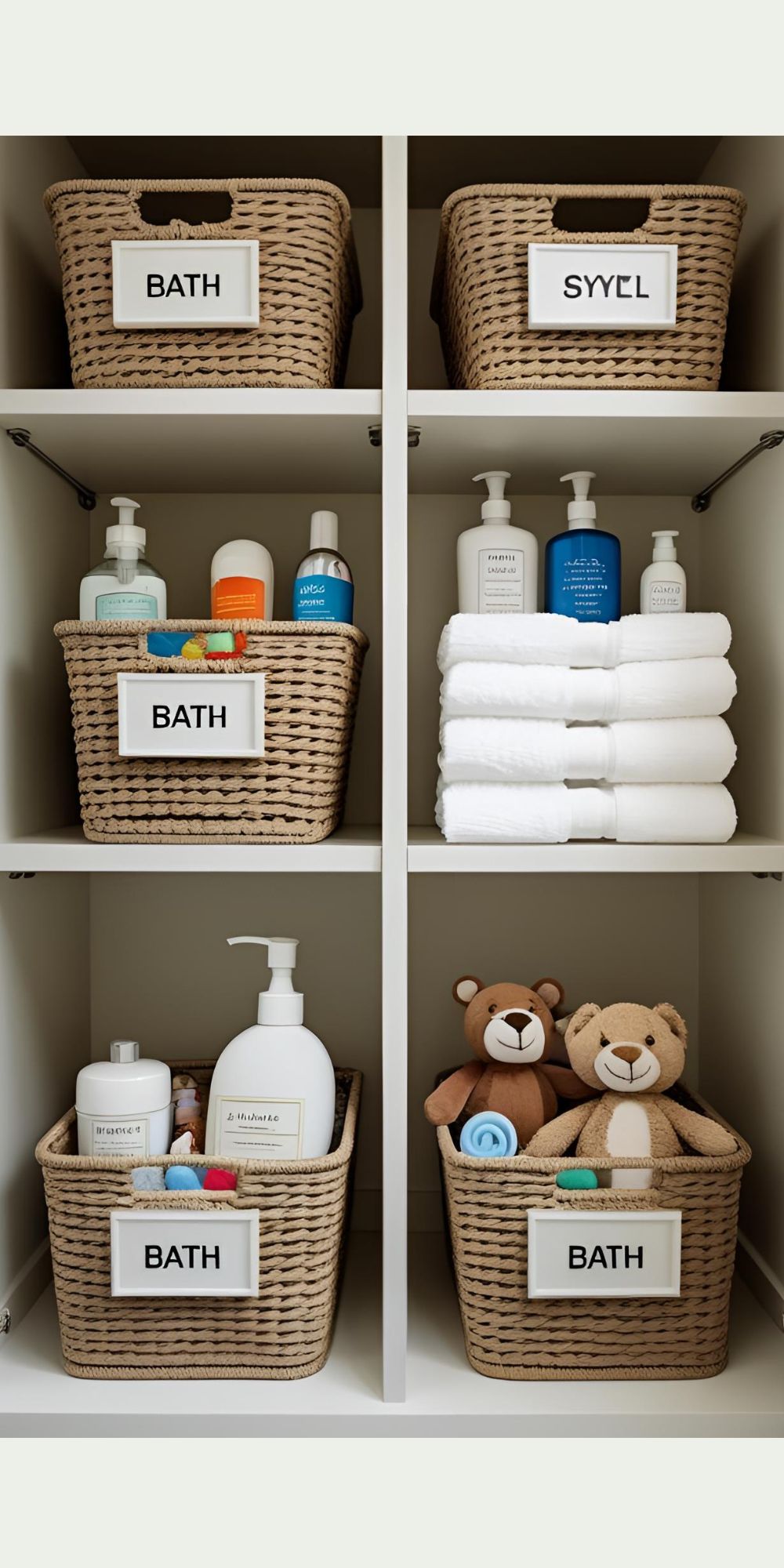 Use labeled baskets for each child to store personal toiletries and bath toys separately.