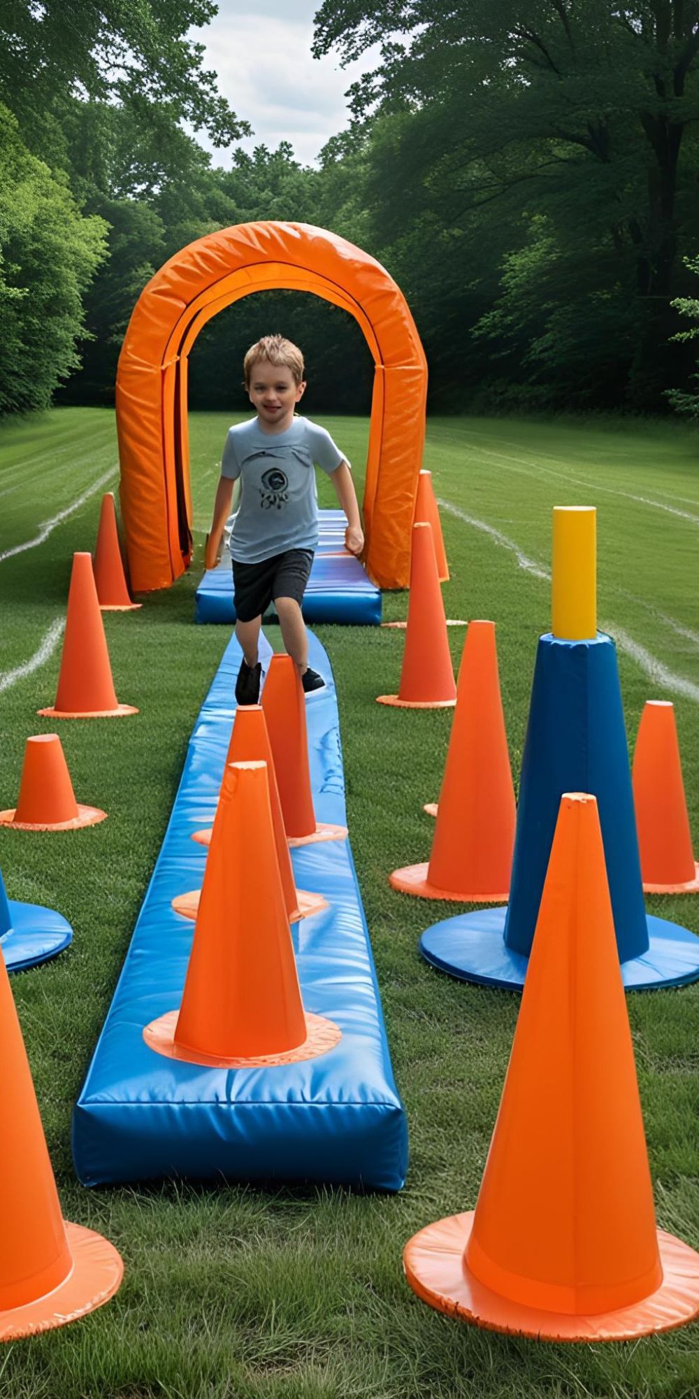 Set up cones, tunnels, and balance beams for kids to race through, adjusting for age-appropriate challenges.