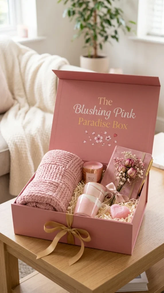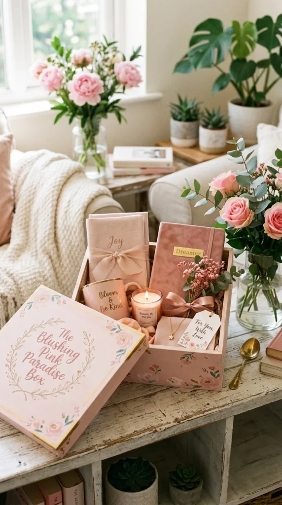 You can start with a pale rose-colored box and fill it with matching items like strawberry-scented soaps, pink stationery, or even a soft and fuzzy pair of socks.