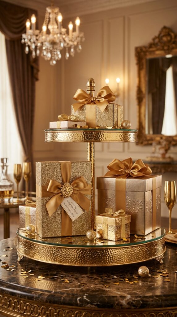 Inside, you can place golden-wrapped chocolates, a shiny brass keychain, or a small notebook with elegant gold-leaf edges that shimmer beautifully in the bright party light.