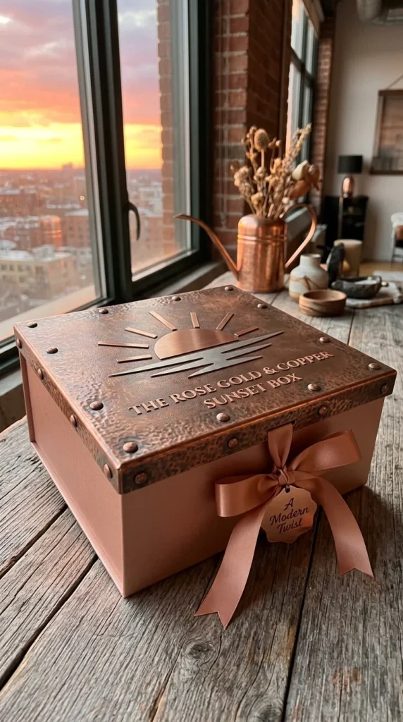 If you want a modern twist on the traditional pink theme, combining rose gold with copper accents creates a warm and very trendy industrial-chic look for gifts.