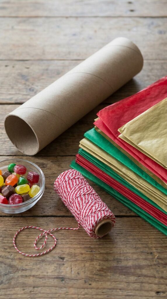 Cardboard tubes from paper towels can be filled with small treats and wrapped in tissue paper to look like giant festive crackers.