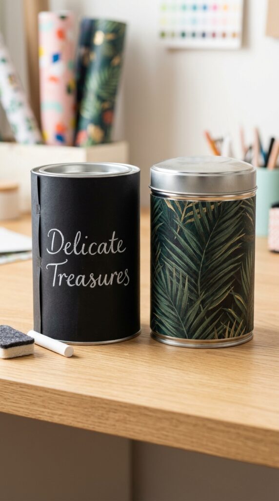 Empty metal coffee tins or large nut canisters offer a sleek, industrial shape that is perfect for protecting delicate or fragile presents.
