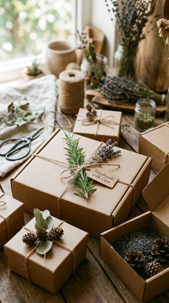 To take your recycled boxes to the next level, consider adding elements from nature like dried lavender or small pine cones.