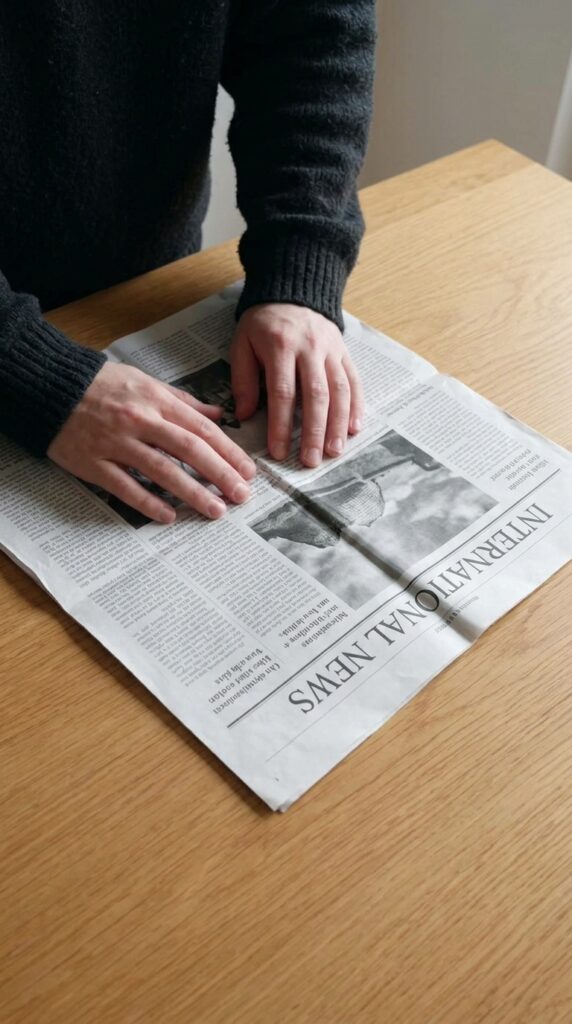 Top the box with a bright red flower made from more folded newspaper to add a striking contrast that catches the eye immediately.