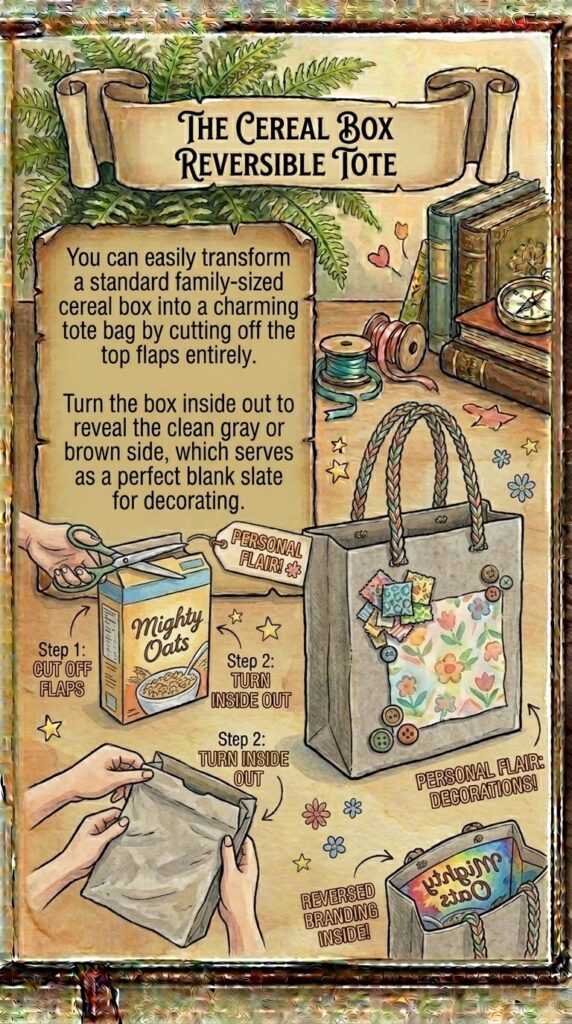 You can easily transform a standard family-sized cereal box into a charming tote bag by cutting off the top flaps entirely.