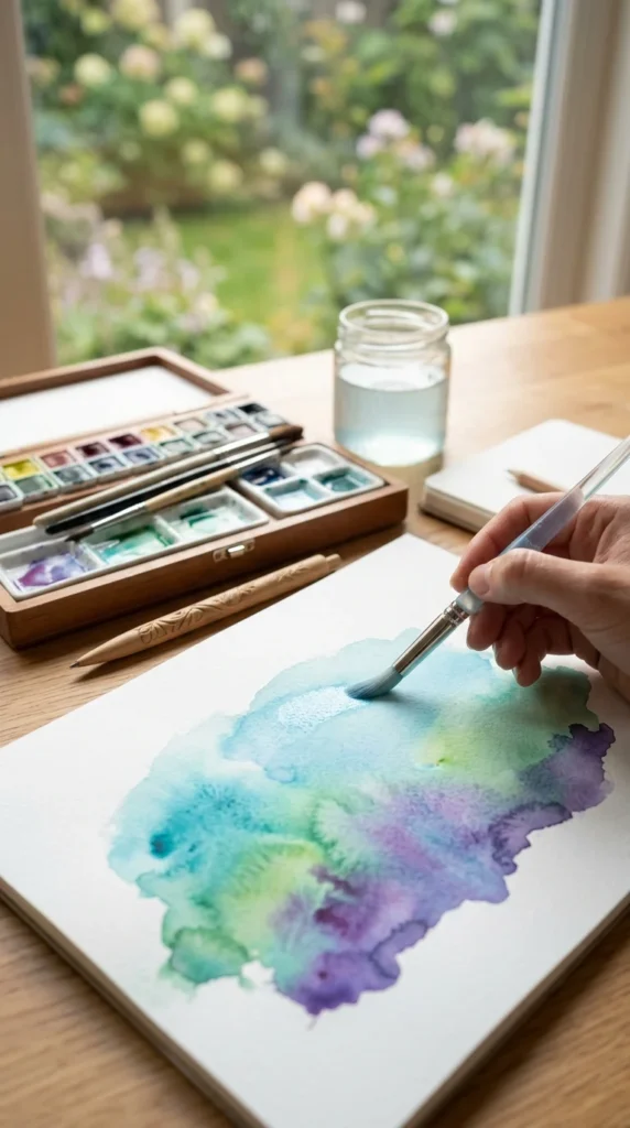 You can assemble a beautiful set including a small palette of watercolor paints, a couple of high-quality brushes, and a pad of thick, textured paper.