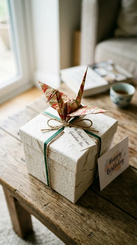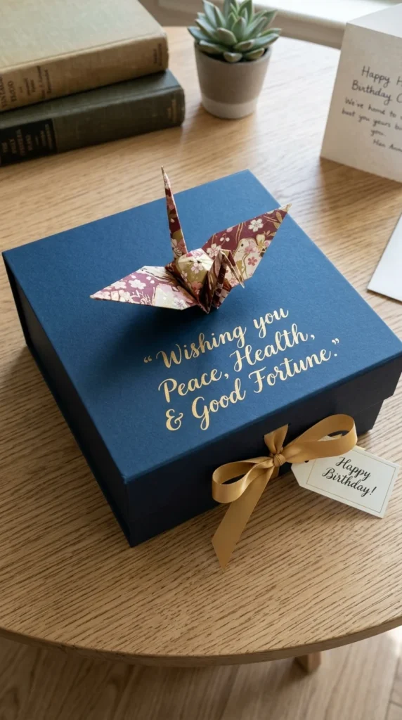 The origami crane is a powerful symbol of peace, health, and good fortune, making it the most meaningful accent for a birthday gift box.