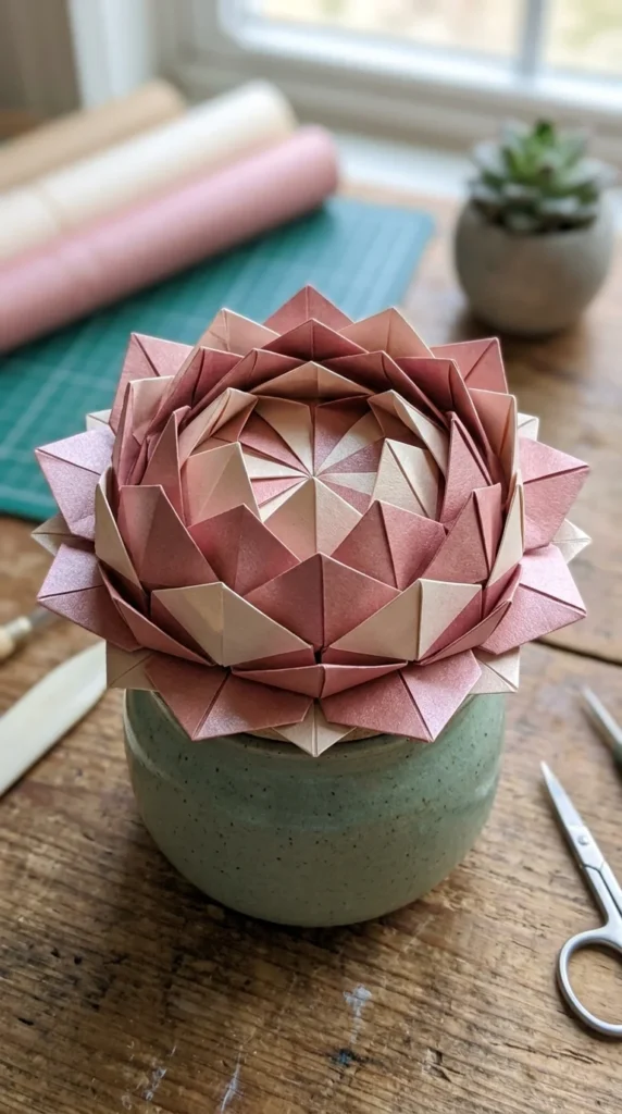 A blooming lotus flower made from multiple folded petals adds a stunning three-dimensional texture that looks incredibly complex but is actually very easy to achieve.