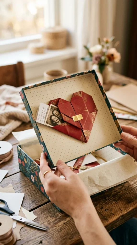 An origami heart that doubles as a small envelope can be glued to the inside of the lid to hide a secret message or photo.