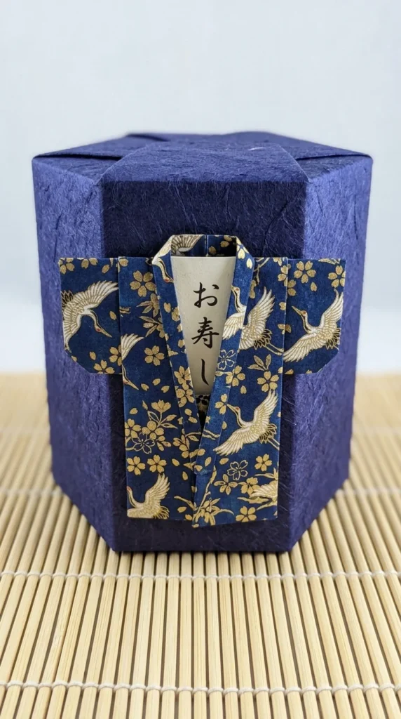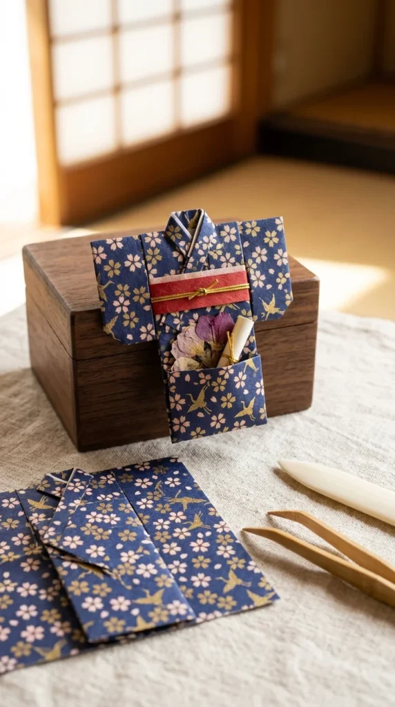 You can fold a flat sheet of paper into the shape of a miniature kimono and use it as a decorative pocket on the box.