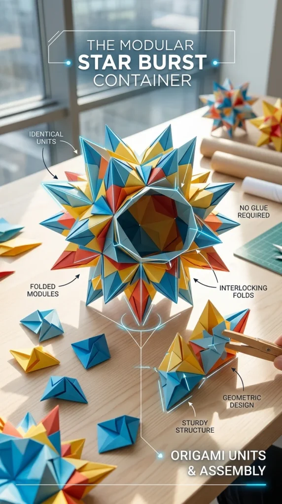 Modular origami involves folding several identical units and interlocking them without any glue to create a sturdy and very impressive geometric star or sunburst shape.